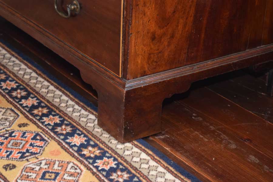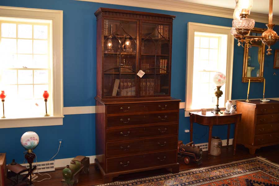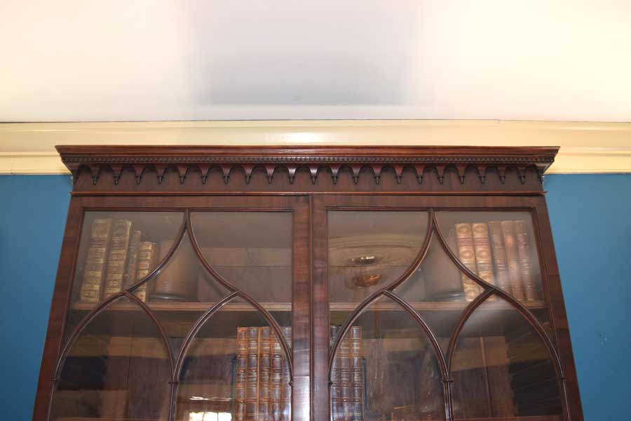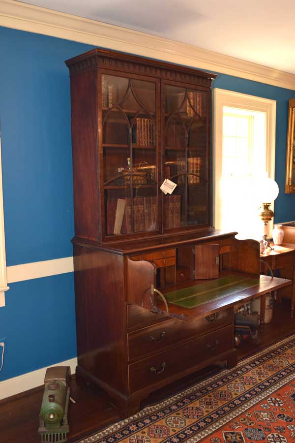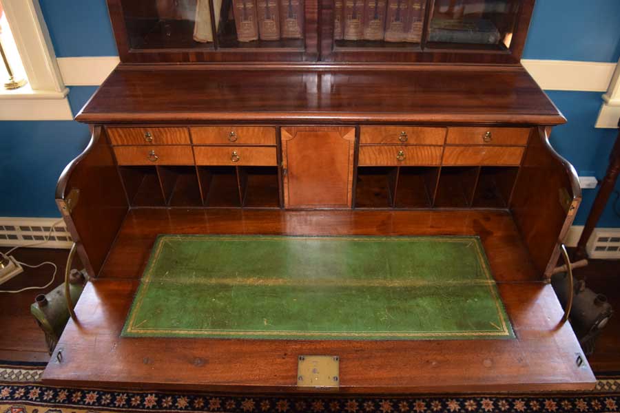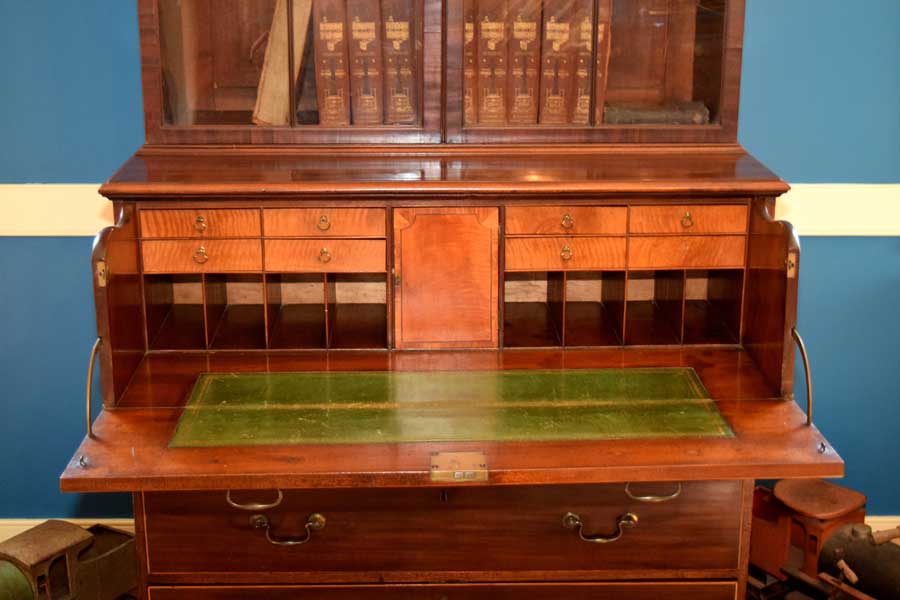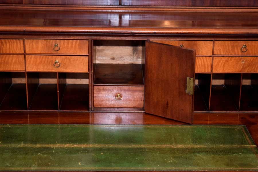 A commanding piece, this Butler’s secretary sure does grab one’s eye. The curved mullions are simply outstanding and the wavy glass is delightful. Look closely at the cornice. It features dental work and an Arabic arch.Next is the base, all of the feet and hardware are original. The interior features satin wood veneered drawer and door fronts with a leather writing surface. It stands 7′ 4 3/4″ tall, 43 1/4″ wide and 23″ deep too. While the feet are a simple Chippendale bracket foot, the rest of the piece screams Hepplewhite. The only knock on it is a light ring mark on the top, right corner of the base. Good pictures of it are included. This does not alter our opinion on the piece one bit. All in all, this piece is totally original. English. Circa 1790.