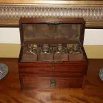 An English, mahogany medicine chest. Four of the bottles are original in the top section and four in the bottom are original too. One bottle has some cracks to it.