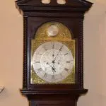 A beautiful, mahogany tall case clock with its original brass works. This clock has so much going for it that it is difficult to know where to start. First, standing 7’ 6” tall, it is a striking piece. Next, the eye is drawn up to the broken pediment on the bonnet with dental work.