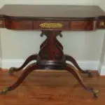 An outstanding mahogany gaming, or card, table with a lovely double lyre (harp) base. The finish is original and in great condition. The decorative features painted on the legs are acanthus and may have been painted by John Penniman. (more…)