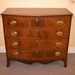 An elegant, Hepplewhite bow front chest. Made with a solid cherry top and sides, it is the front that sets the stage. Each drawer front features flame birch with a paneled center out of the same birch. This characteristic points to New Hampshire, or possibly Massachusetts origin. (more…)