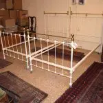 A beautiful pair of cast iron beds decorated with brass finials and rods on the head and foot board. The combination is quite lovely. Each bed fits a twin mattress and box spring. (more…)