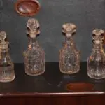 Four of an assortment of decanters we recently purchased from an estate. All of these are in good order with no cracks or breaks. All exhibit some wear. More than likely, they were all made in England. Starting from the left: