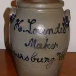 Stoneware Ovoid Crock, marked “H. Loundes Maker Petersburg, Va” in Cobalt, applied handles, 2 gallon, 12.25 h x 8.5″d, – no apparent chips or cracks.