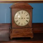 A nice Regency bracket clock with Fuzzee movement. The mahogany veneer is over English oak. The clock works are original and have been restored. The feet are original. It is 12 1/4″ wide, 7″ deep, and 18″ tall. Circa 1820.