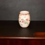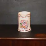 A delightful Chinese export mug in the shape of a barrel. It is covered in polychrome enamels. The top has a trellis diaper-floral border above the scrolling. (more…)