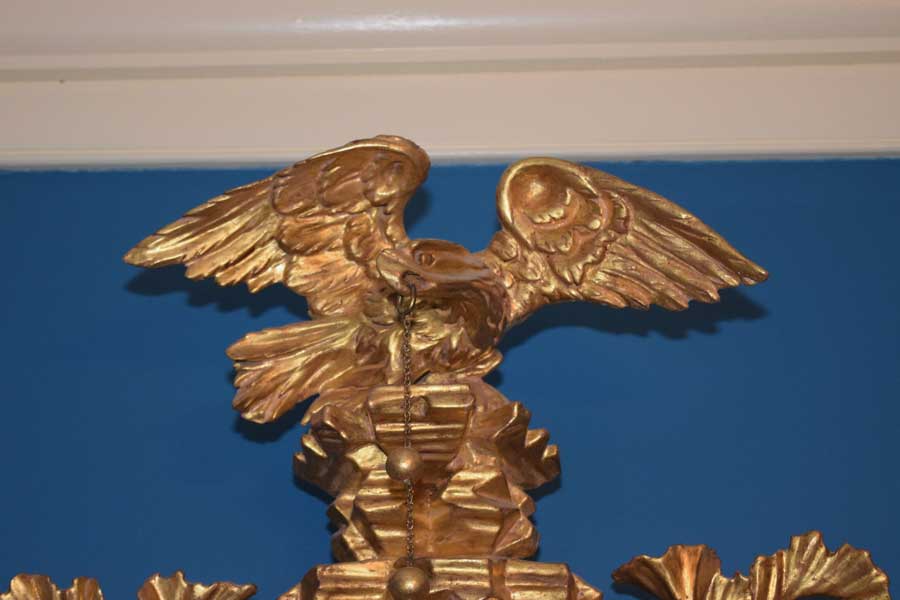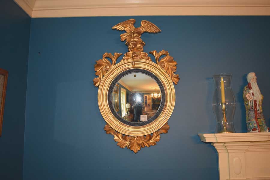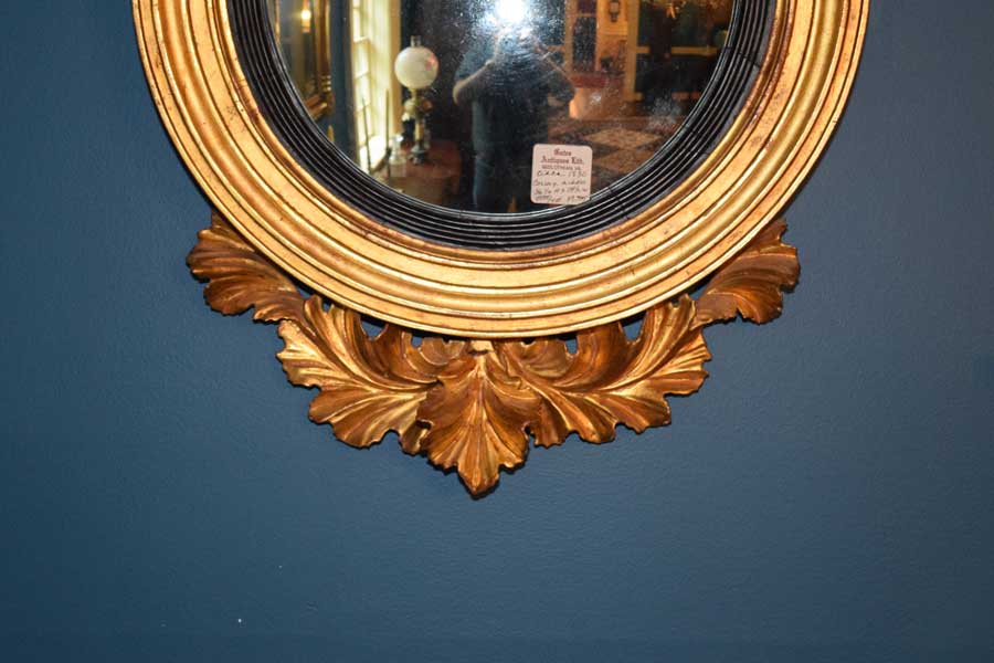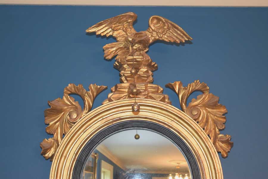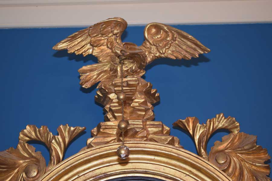 A magnificent, convex mirror covered in gold leaf. What an incredible piece! Look closely at the eagle. One can see the tension in the carving of it unfurling its wings to take off. The detail and movement are wonderful.The acanthus leaf carvings are of equal quality too. Most importantly, all of the elements do appear to be original. From the backside, I suspect the right wing has been repaired at some point in its life. It was done beautifully and one cannot tell from the front. It is approximately 36 1/2″ tall and 23 1/2″ wide from eagle to leaf and leaf to leaf. It has been about 20 years since we have had one in this condition. If one is looking for a convex mirror, it would be difficult to find better. Circa 1830.